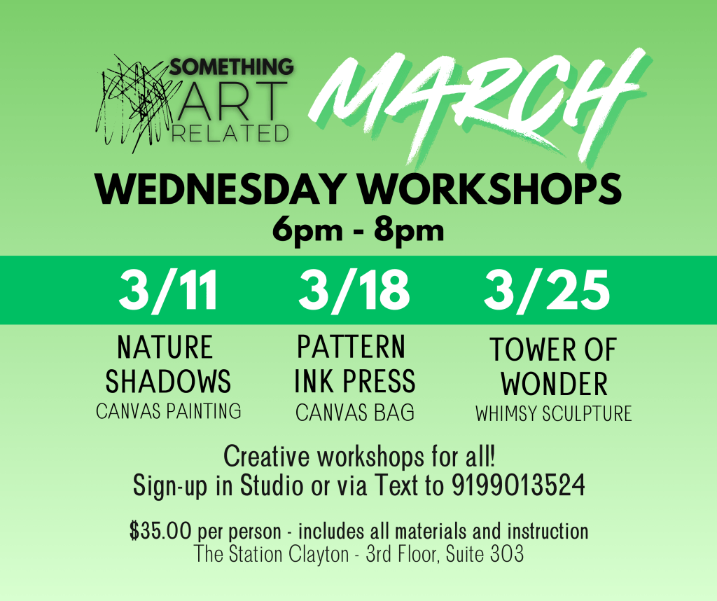 Wednesday evening workshops, from 6pm to 8pm, are a great way to break up the week and get some creativity in. Sign up for a workshop in the studio or text 9199013524. Cost is $35 per person and includes all materials and instruction. Space is limited so sign up early! Contact Jen Kehrer if questions!